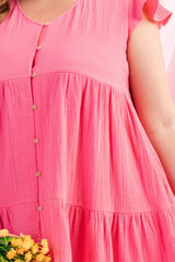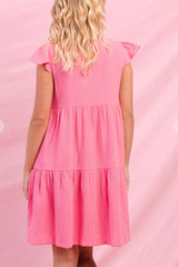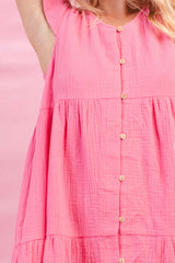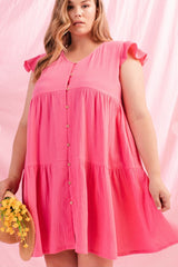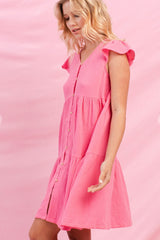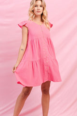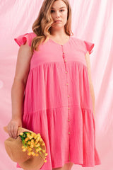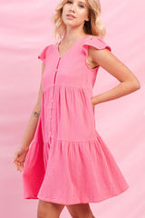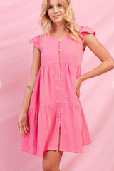 This traditional neck line cotton dress has a delicate flutter cap sleeve and front buttons.