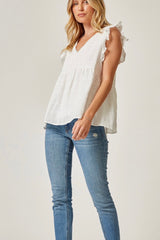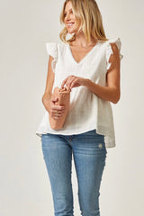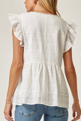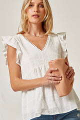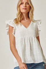 This babydoll top features flutter sleeves, v neckline with pom pom detail. Cotton texture fabrication with easy fit.