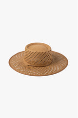 Natural brown 100% paper straw trimmed with brown waxed rope chin strap and bead toggle.