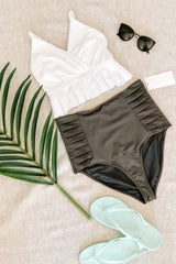 The "Monroe" High Waist Pleated Bikini Bottom in Stone Grey