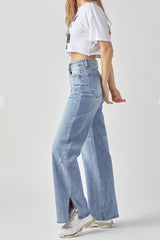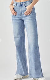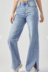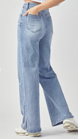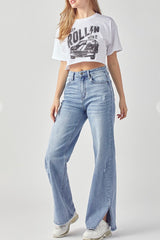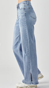 Perfectly washed high waist jeans in a desired medium wash with a wide leg with side slit detail at the ankle. Nice amount of a stretch in these ones.