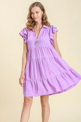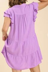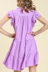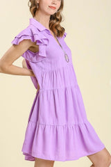 Lavender Linen Blend Ruffle Sleeve Collared Tiered Dress