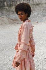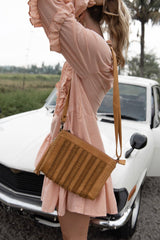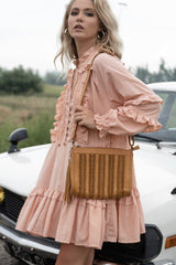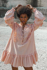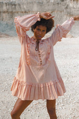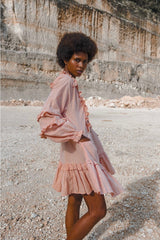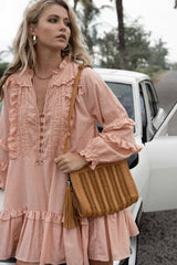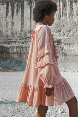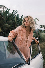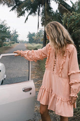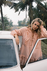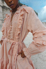 Mahli Gingham is here! The Venice Beach Gingham Smock is the comfiest dress you will ever wear. Featuring romantic and detailed stitching, pockets, tortoise shell button, tassels with brass beads, a ruffled tiered hem and a detachable waist tie.