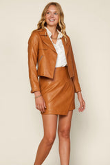 This is the softest most lux vegan leather jacket. The cropped sleeve moto style jacket pairs perfectly with the short matching skirt, a pair of your favourite jeans or with a cute dress.