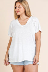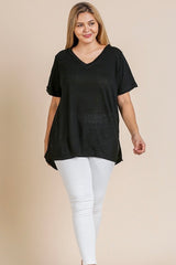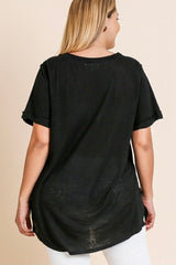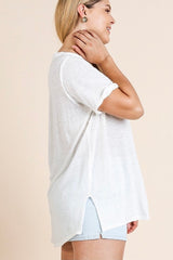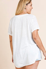 It doesn’t get much better than this in a loose slightly oversized t-shirt v-neck tunic top. Made from natural fibres so it’s light and airy and it has the perfect length to wear with tights, or front tuck and wear with jeans.