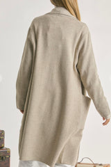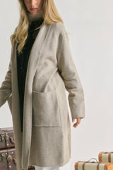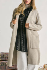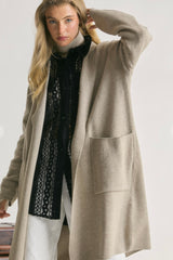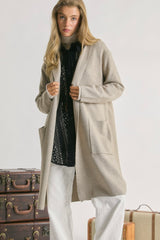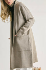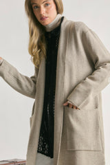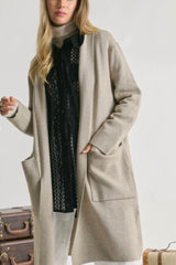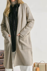 This is a medium weight cardigan coat with large pockets and shawl collar. Its perfect for layering. Looks fantastic with denim.