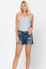 Mid-Rise Distresed Patch Cut Off Shorts, for those who love distressed but hate exposed skin.