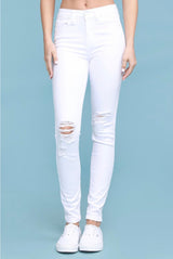 The Jilly high waist distressed knee white skinny jeans are the best fitting denim you will ever own and they pair perfectly with all your oversized sweaters.