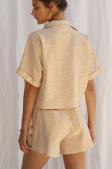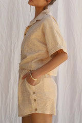 Beautiful gold tone shorts with side button detail. Our High Desert Collection is made with eco-friendly vegetable dyes, free of pollutants & allergens and derived from completely natural sources. The technology of vegetable dye production dates back to the first century b.c. and allows for the beauty of natural colors to be showcased in their fullest splendor.