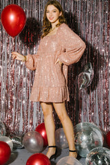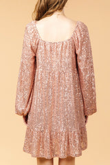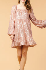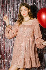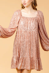 The cutest baby doll you ever did see in Rose gold sequins, balloon sleeve and a ruffled hem. Fully lined with a soft comfortable lining.