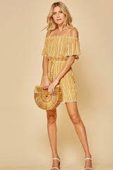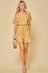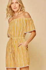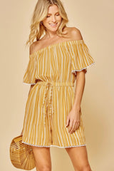 Mustard striped romper with elastic waistline and the cutest Pom Pom lace details.