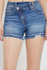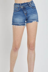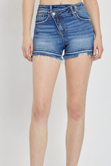 Comfortable loose fitting mid rise denim shorts with the trendy cross over front fly.