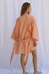 A beautiful Kimono with waist tie. The High Desert Collection is made with eco-friendly vegetable dyes, free of pollutants & allergens and derived from completely natural sources. The technology of vegetable dye production dates back to the first century b.c. and allows for the beauty of natural colors to be showcased in their fullest splendor.